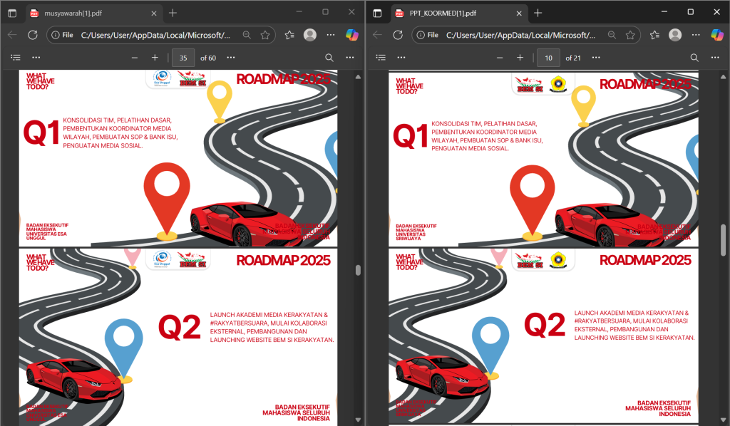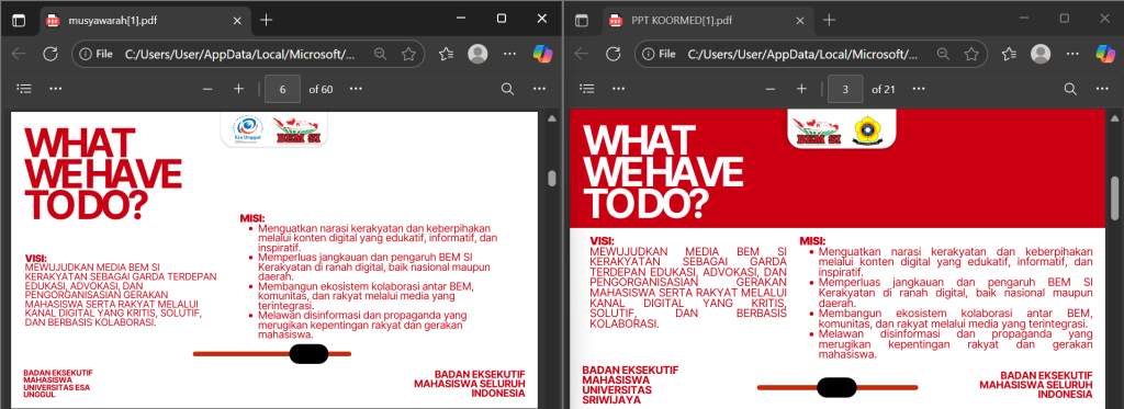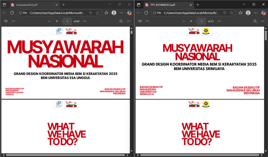 Tampilan Slide Grand Design Milik BEM Universitas Esa Unggul (kiri) dan Grand Design yang Dibawa oleh BEM Universitas Sriwijaya (kanan) dalam forum Musyawarah Nasional BEM SI Kerakyatan. Sumber: Informan yang Tidak Ingin Disebutkan Namanya.