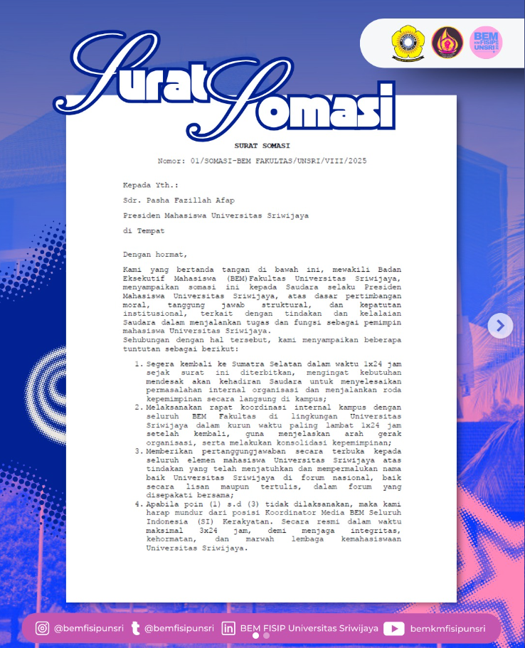 Palembang, lpmlimas.com – Tiga Badan Eksekutif Mahasiswa Fakultas Universitas Sriwijaya, yakni Fakultas Keguruan dan Ilmu Pendidikan (FKIP), Fakultas Hukum, dan Fakultas Ilmu Sosial dan Politik (FISIP), mengunggah surat somasi yang ditujukan kepada Ketua BEM Unsri 2025, Pasha Fazilla Afap, pada Jumat (08/08) melalui unggahan feeds akun Instagram dari ketiga BEM Fakultas tersebut.