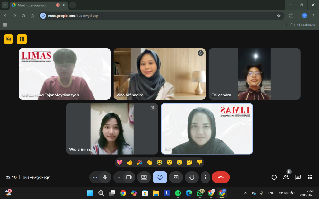 Tangkapan Layar Sesi Wawancara Daring Melalui Google Meet Antara Tim LPM Limas dan Edi Candra pada Jumat (8/08). Sumber: Tangkapan Layar yang Diambil Oleh TIM LPM Limas pada Jumat Malam (08/08).