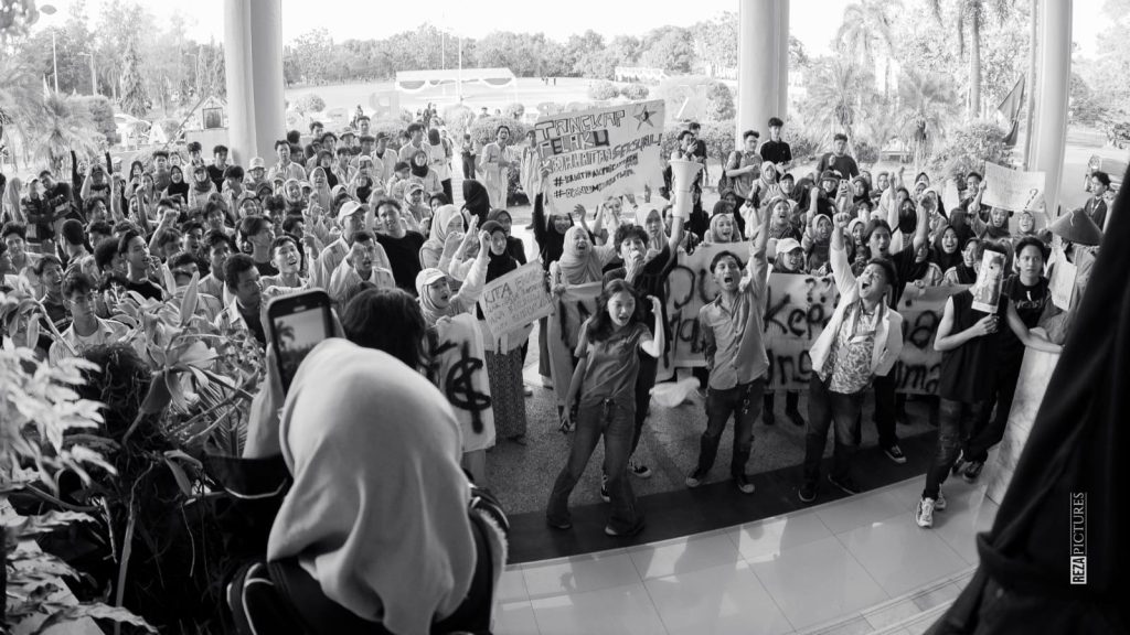 Demonstran menuntut tindakan tegas dari pihak kampus terkait kasus pelecehan seksual di depan Gedung Rektorat Universitas Sriwijaya, Indralaya (28/10). @unsriquotes/Reza Picture.